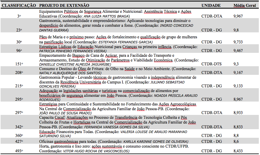 A Direção do CTDR parabeniza os coordenadores e colaboradores dos projetos de extensão aprovados com bolsas no edital PROBEX 2020. Foram ao todo 18 propostas enviadas por professores do CTDR, sendo 100% (todas) destas aprovadas com recursos (bolsas estudantis). O Departamento de Gastronomia estará executando 9 projetos, o Departamento de Tecnologia em Alimentos executará 4 projetos e o Departamento de Tecnologia em Produção Sucroalcoleira executará 3 projetos neste Edital PROBEX 2020. Ainda teremos a execução de dois projetos pela Direção do Centro (coordenados por professores do DTA), sendo um da Assessoria de Extensão e o outro do CVTSAN, ambos considerados Ação Permanente da PROEX (Pró-Reitoria de Extensão).