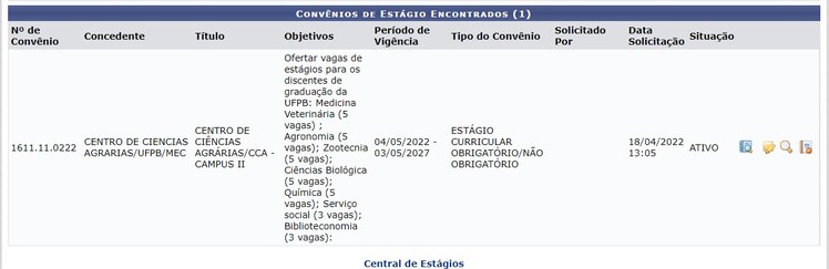 Tendo em vista o esforço e orientação da Direção de Centro, foi criado o Convênio Centro de Ciências Agrárias/UFPB/MEC, sendo assim os discentes devem fazer o cadastro de Estágio Obrigatório no convênio CCA e os Estágios Não Obrigatórios devem ser cadastrados no convênio UFPB, assim também renovação do Bolsa estágio e contração: convênio da UFPB: